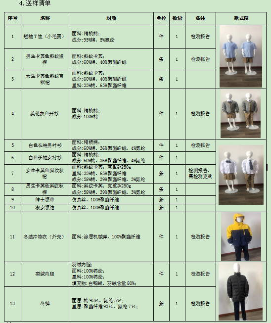 4.采購需求:常州市新北區新龍實(shí)驗學(xué)校(小學(xué)部)校服采購項目,包括校服制作、運抵、卸貨至采購人現場(chǎng)指定位置,通過(guò)采購人及其他相關(guān)部門(mén)的驗收,直至發(fā)放和余貨取回等全過(guò)程工作,其中每套校服包含:短袖T恤(小毛圈)1件、卡其色斜紋短褲/卡其色斜紋百褶裙1條、英倫灰色開(kāi)衫1件、襯衫1件、卡其色斜紋秋褲/卡其色斜紋秋裙1條、紳士領(lǐng)帶1條/淑女領(lǐng)結1個(gè)、沖鋒衣加內膽1件、冬褲1條、精繡校標1個(gè)(贈送);中標單位按照采購人提供的款式、顏色要求制造校服,校服面料必須與采購需求中一致。