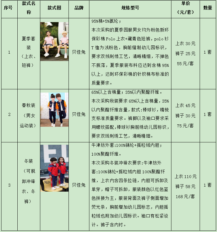 數量:夏季套裝(上衣、短褲)1套、春秋裝(男女運動(dòng)裝)1套、冬裝
