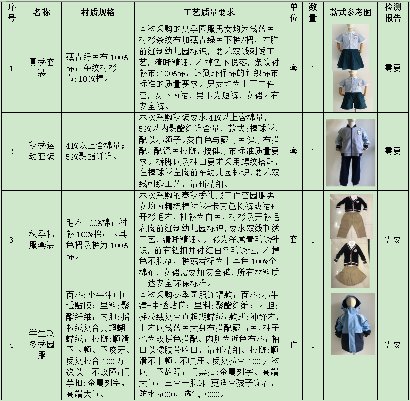 5.項目概況:本項目為常州市新北區春江幼兒園園服采購項目,包括園服制作、運抵、卸貨至采購人現場(chǎng)指定位置,通過(guò)采購人及其他相關(guān)部門(mén)的驗收,直至發(fā)放和余貨取回等全過(guò)程工作。其中每套園服包含:夏季套裝1套,秋季運動(dòng)套裝1套、秋季禮服套裝1套、冬季園服1件。成交單位需等到采購人新生報到,征得2/3以上家長(cháng)同意后,雙方才履行合同,采購人負責將采購款式、數量交予成交單位,成交單位按照采購人提供的款式、顏色要求制造校服,校服面料必須與采購需求中一致。貧困學(xué)生校服征訂工作按教育主管部門(mén)相關(guān)文件執行。成交單位還需要承擔其他班級園服的增訂工作,具體數量?jì)r(jià)格按照現有標準實(shí)行。